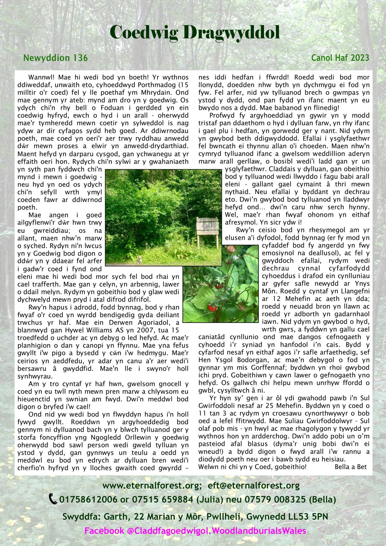 Wannwl! Mae hi wedi bod yn boeth! Yr wythnos ddiweddaf, unwaith eto, cyhoeddwyd Porthmadog (15 milltir o’r coed) fel y lle poethaf ym Mhrydain. Ond mae gennym yr ateb: mynd am dro yn y goedwig. Os ydych chi’n rhy bell o Foduan i gerdded yn ein coedwig hyfryd, ewch o hyd i un arall – oherwydd mae’r tymheredd mewn coetir yn sylweddol is nag ydyw ar dir cyfagos sydd heb coed.